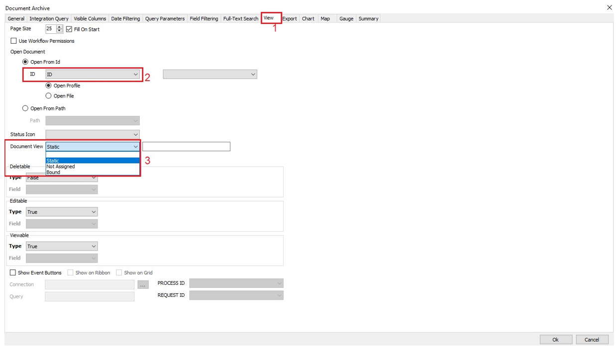 Döküman arşiv oluşturma proses arşiv ile aynı adımlara sahip olup farklı olarak ID alanı bir global doküman numarası yani form ID numarası olmalıdır. Global doküman numarası DOCUMENTS tablosundaki ID alanı veya başka bir veritabanı tablosundaki Form ID alanından getirilebilir. Şekil 40’da, 2 numaralı alanda arşiv için oluşturulan sorguda kolon olarak getirilen Form ID değeri, ID seçilir.