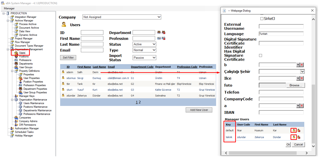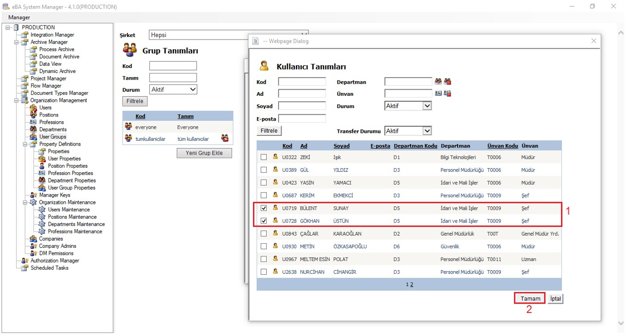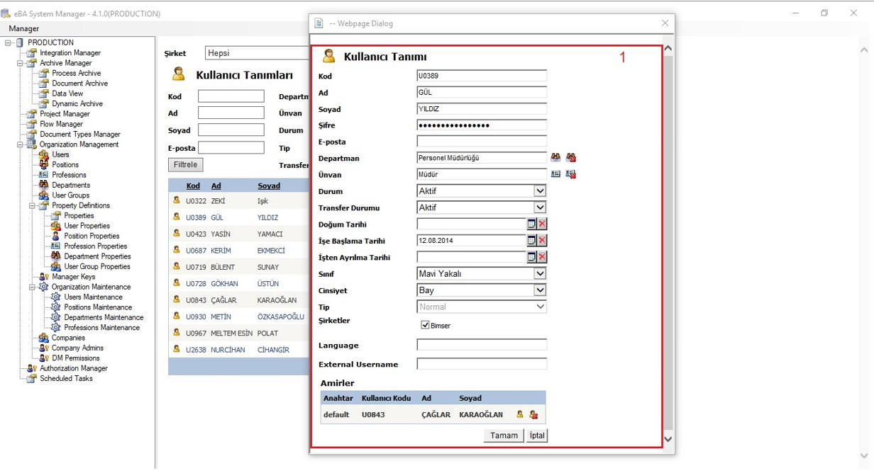 Organizasyon Yönetim menüsünden, eBA iş akışlarında kullanılan kullanıcılar, pozisyonlar, ünvanlar ve departmanlar görüntülenebilir ve düzenlemeler yapılabilir.