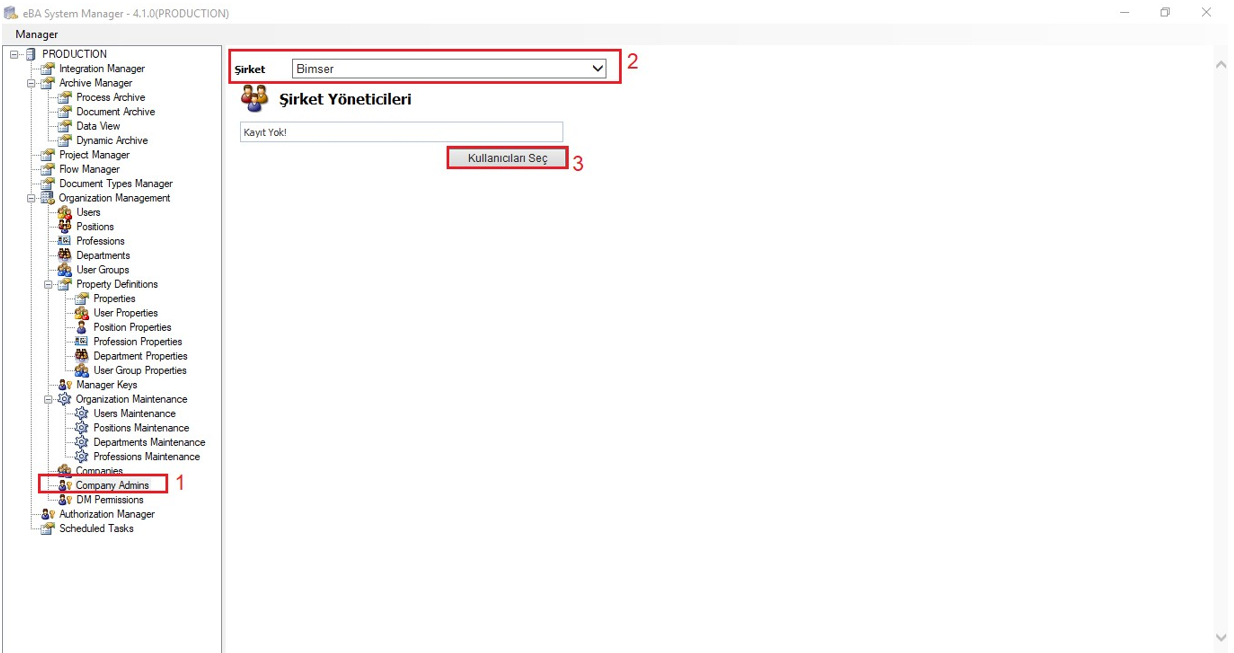 Şirket yöneticilerini eklemek için Şekil 59’da, Company Admins menüsüne tıklanır. 2 numaralı alandan şirket seçimi yapılır. Kullanıcıları Seç butonuna tıklanarak seçili şirkete ait yöneticiler seçilir. Şirket yöneticisi olarak tanımlanan kullanıcı, tanımlandığı şirketin organizasyon yapısını yönetebilir olur.