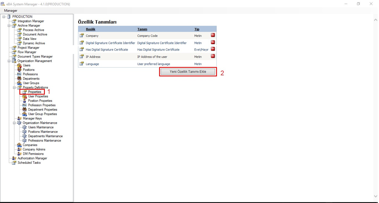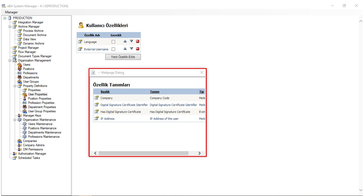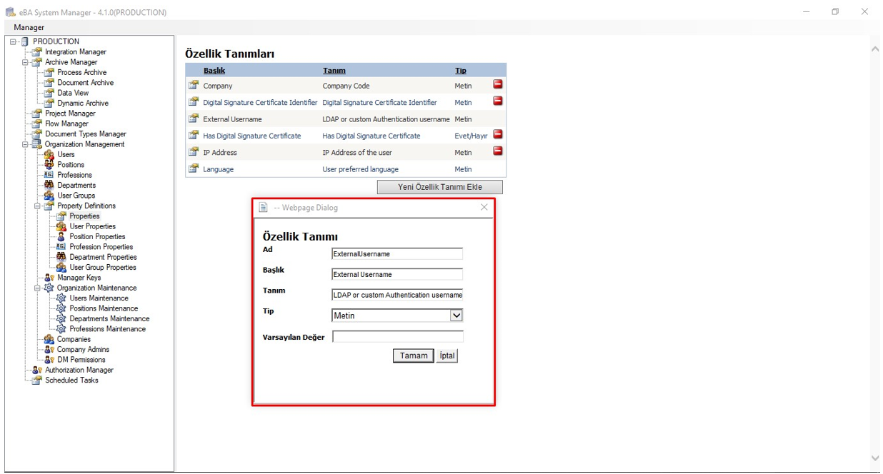 Properties menüsünde eklenecek özellikler tanımlanır. Burada tanımlanan özellikler; kullanıcı, departman, unvan, pozisyon ve kullanıcı grupları özellikleri olarak seçilebilir.