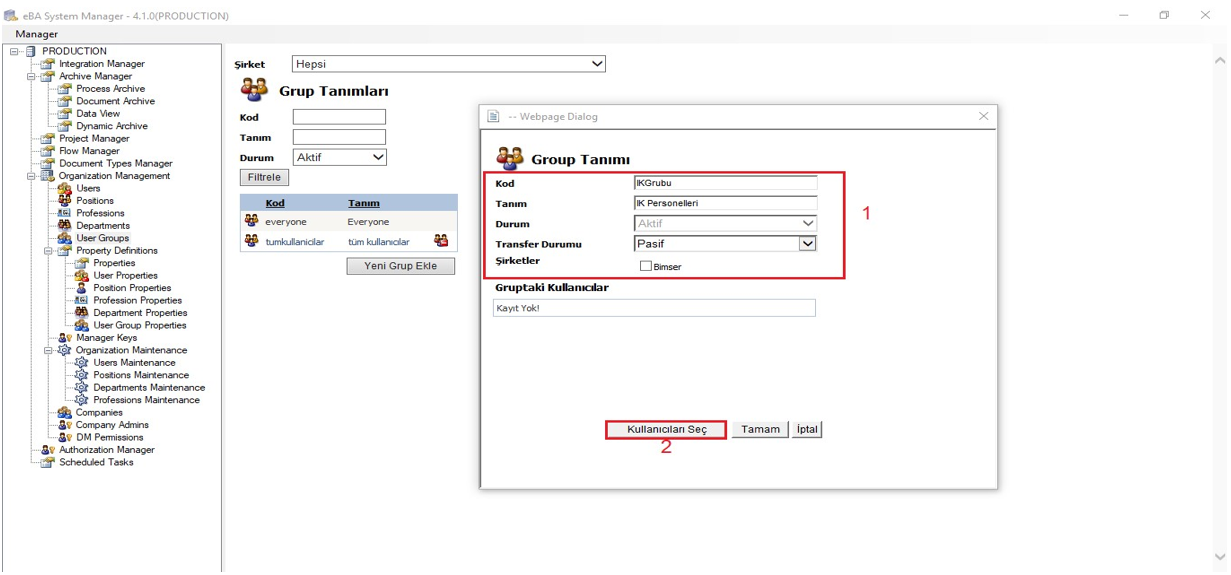 Açılan pencerede 1 numaralı alanda gruba ait özellikler tanımlanır. Kullanıyı gruba eklemek için Kullanıcıları Seç butonuna tıklanır.
