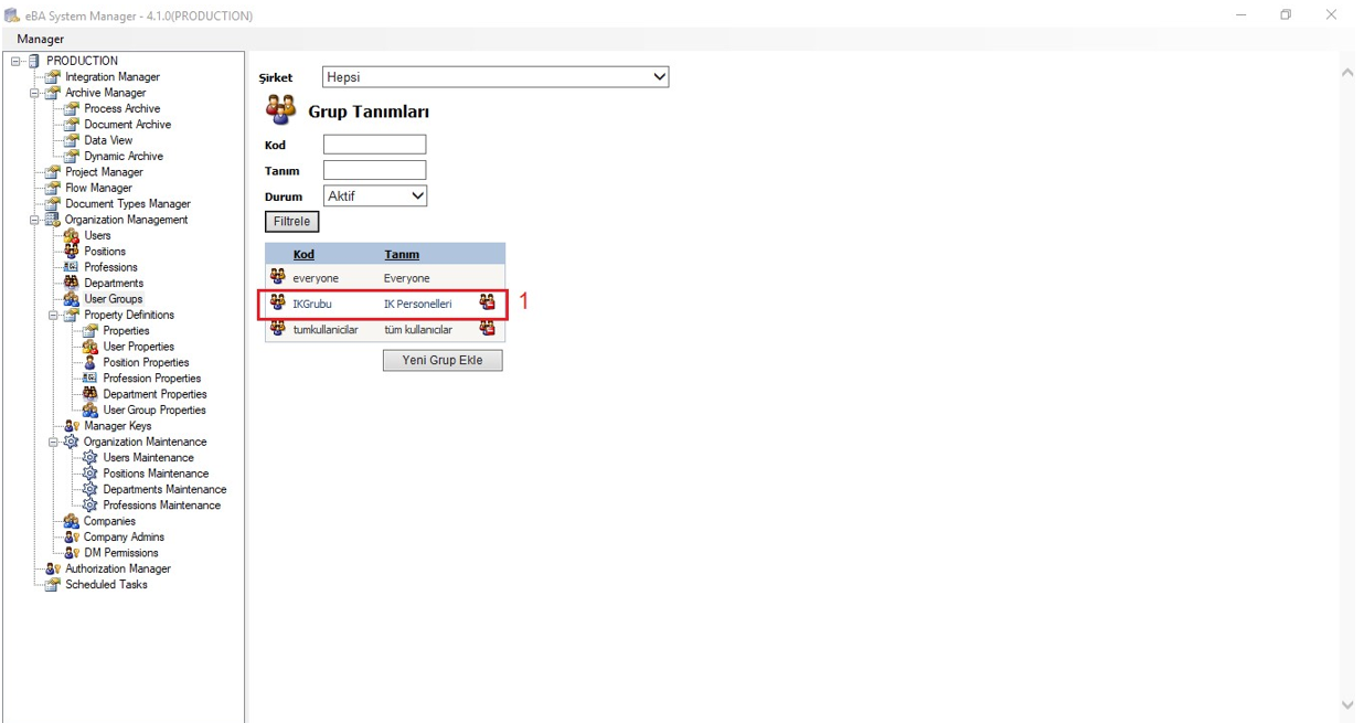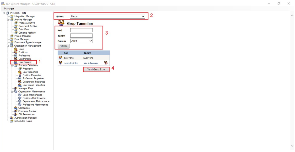 Aynı özelliğe sahip kullanıcılar bir grup altında toplanarak kolayca yönetilebilir. Kullanıcıyı bir gruba dahil etmek için Şekil 49’da, User Groups menüsü tıklanır. 2 numaralı alandan şirket seçilir. 3 numaralı bölümde var olan gruplar içerisinde filtreleme yapılabilir.Yeni grup eklemek için Yeni Grup Ekle butonuna tıklanır.