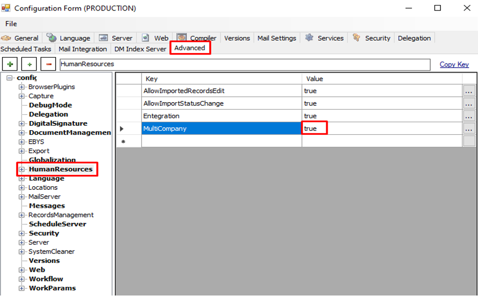 Not: Companies ve Company Admins başlıkları, organizasyonda çoklu şirket yapısı mevcutsa görünür. Çoklu şirket yapısını aktif etmek için, eBAConfigurationEditor.exe açılıp Advance sekmesine gelinerek HumanResources düğümüne tıklanır. Yanda açılan panelde “MultiCompany” anahtarının değeri true yapılır ve File alanından config kaydedilir. Bu işlemden sonra Companies ve Company Admins başlıkları System Manager da görünür olur. İlgili kısımda “MultiCompany” isimli key yoksa manuel ekleyebilir ve değerini atayabilirsiniz.