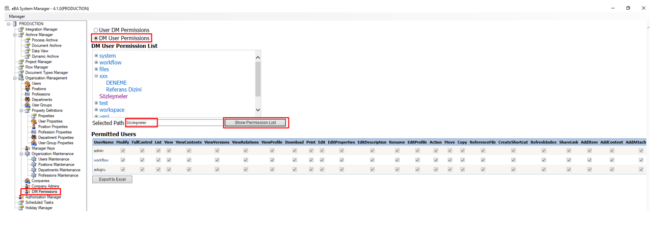 Bu alanda “DM User Permissions” seçeneği seçili iken, Doküman Yönetim yapısı ekranda görünür. Bu yapıda seçilen bir kütüphane ya da klasör üzerinde kimin ne yetkisi olduğu bilgisi “Show Permission List” butonuna basılarak listelenebilir ve bu liste “Export to Excel” butonu ile excel e aktarılabilir.