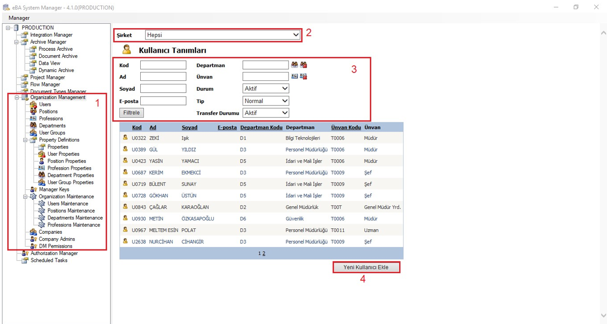 2 numaralı alan, sistemde birden çok şirket tanımı mevcutsa görünür olacaktır. Bu alandan şirket seçimi yapılır. Hepsi seçilir ise tüm kullanıcılar listelenir. 3 numaralı bölümdeki alanlardan filtereleme yapılarak istenilen kullanıcılar üzerinde arama yapılabilir. Yeni kullanıcı eklemek için Yeni Kullanıcı Ekle butonuna tıklanır. Listelenen kullanıcılar üzerinde değişiklik yapmak için ilgili personel üzerine tıklanarak kullanıcı özellikler penceresi açılır.