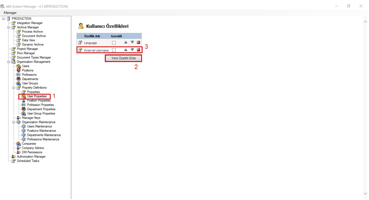 Şekil 53’te, Properties menüsü açılır. Eğer Özellik Tanımları içinde ExternalUsername yok ise 2 numaralı alandaki butona tıklanır.
