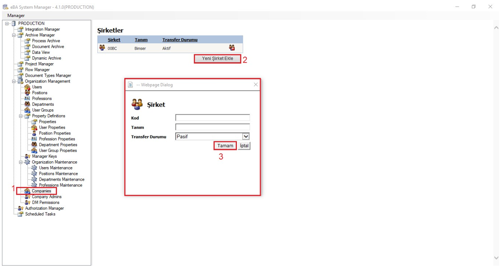 Organizasyonda birden çok şirket tanımı mevcutsa, yeni şirket eklemek için Şekil 58’de, Companies menüsü tıklanır. Yeni Şirket Ekle butonuna tıkladıktan sonra Kod alanına şirket kodu, Tanım alanına şirket adı yazılır. Eğer şirket bilgileri harici HR uygulamalarından transfer edilecek ise Transfer durumu, Aktif , yoksa Pasif olarak seçildikten sonra Tamam butonu tıklanır.