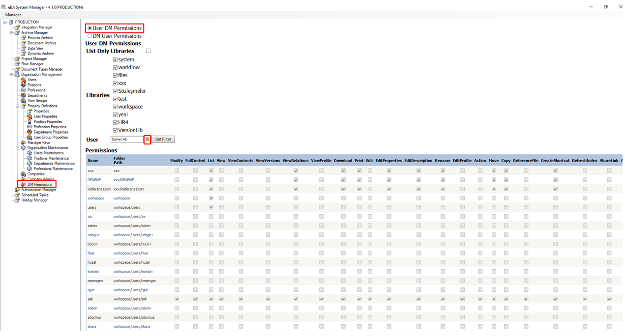 Bu alanda Doküman Yönetim sisteminde verilmiş, Kullanıcı bazlı ve DM bazlı yetkilendirmeler listelenebilir. Bu alanda “User DM Permissions” seçeneği seçili iken, User alanından bir kullanıcı seçilip “Set Filter” butonuna basıldığında, o kullanıcının DM deki klasör ve kütüphaneler üzerindeki yetkileri listelenir ve bu liste “Export to Excel” butonu ile excel e aktarılabilir.