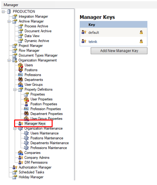 Organizasyon içerisinde kullanıcıların, farklı yönetici profillerine ait yöneticileri mevcutsa, tüm bu yönetici profil tanımları bu başlık altında tutulur. Sistemde herhangi bir amir anahtarı tanımlanmadığı durumda varsayılan olarak “default” amir tanımı mevcuttur. Bir kişinin varsayılan amiri başka biri, teknik amiri başka biri, operasyonel amiri başka biri olabilir. İşte bu gibi bir personelin birden çok profilde amir tanımı mevcutsa, bu amir profilleri, Manager Key olarak bu başlık altında tanımlanır.