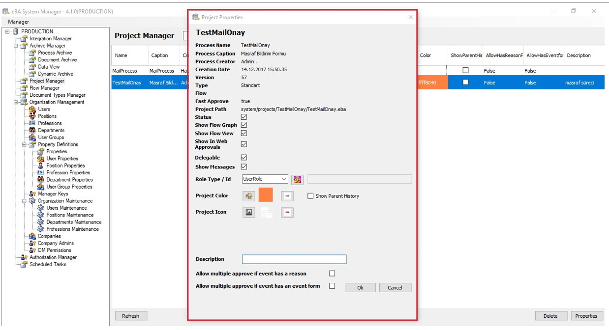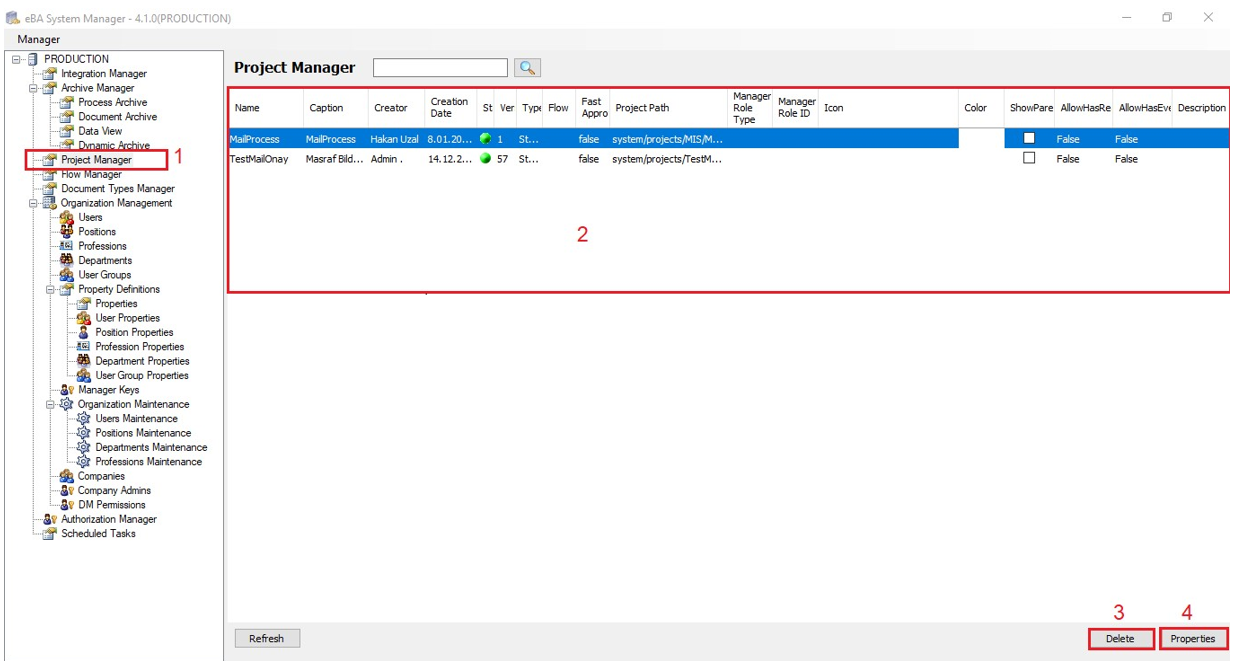 Şekil 41’de, Project Manager menüsüne tıklanır. 2 numaralı alanda sistemde var olan süreçler listelenir. Oluşturulan süreci sistemden silmek için ilgili süreç seçildikten sonra Delete, ilgili sürecin özellikler penceresini açmak için Properties butonuna tıklanır.