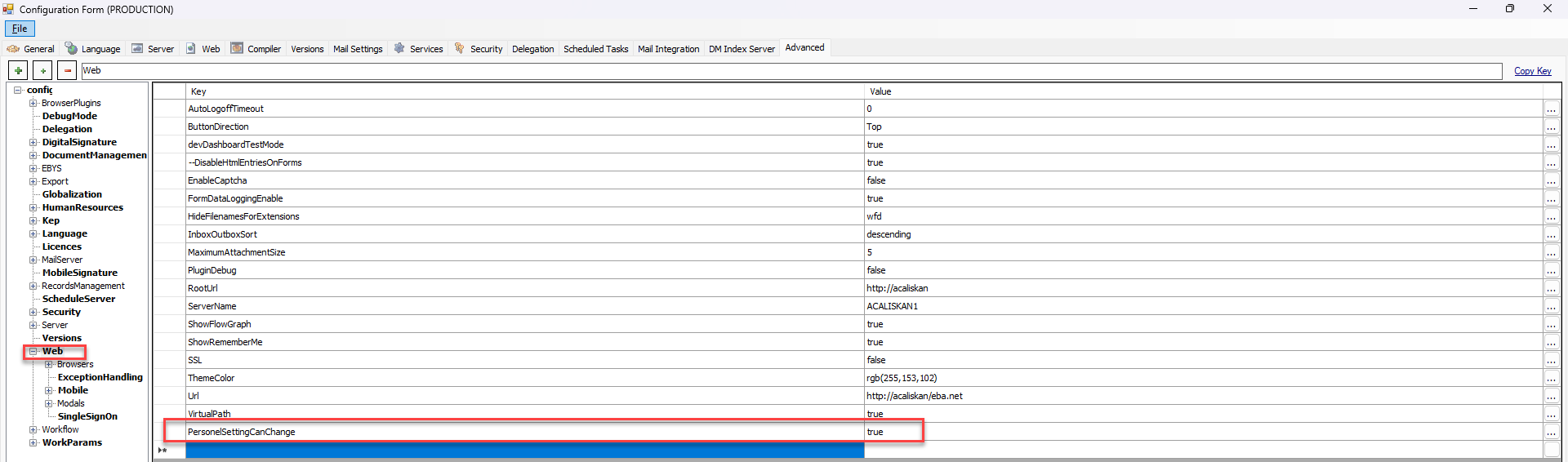 Tüm kullanıcıları kişisel ayarlar (Tema rengi)'nin değiştirilmesine izin vermek için, eBAConfigurationEditor.exe > Advanced > Web dalında PersonelSettingCanChange anahtarını tanımlayıp, değer olarak true işaretlemeniz gerekmektedir.