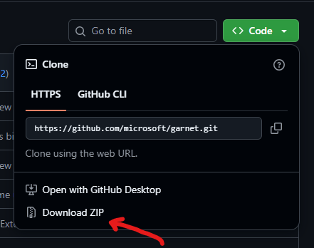 Aşağıdaki GitHub linkinden Garnet'ın source code'u *.zip olarak indirilmelidir. İndirilen *.zip dosyası ayıklandıktan sonra ayıklanan klasör C:\garnet konumuna taşınmalıdır.