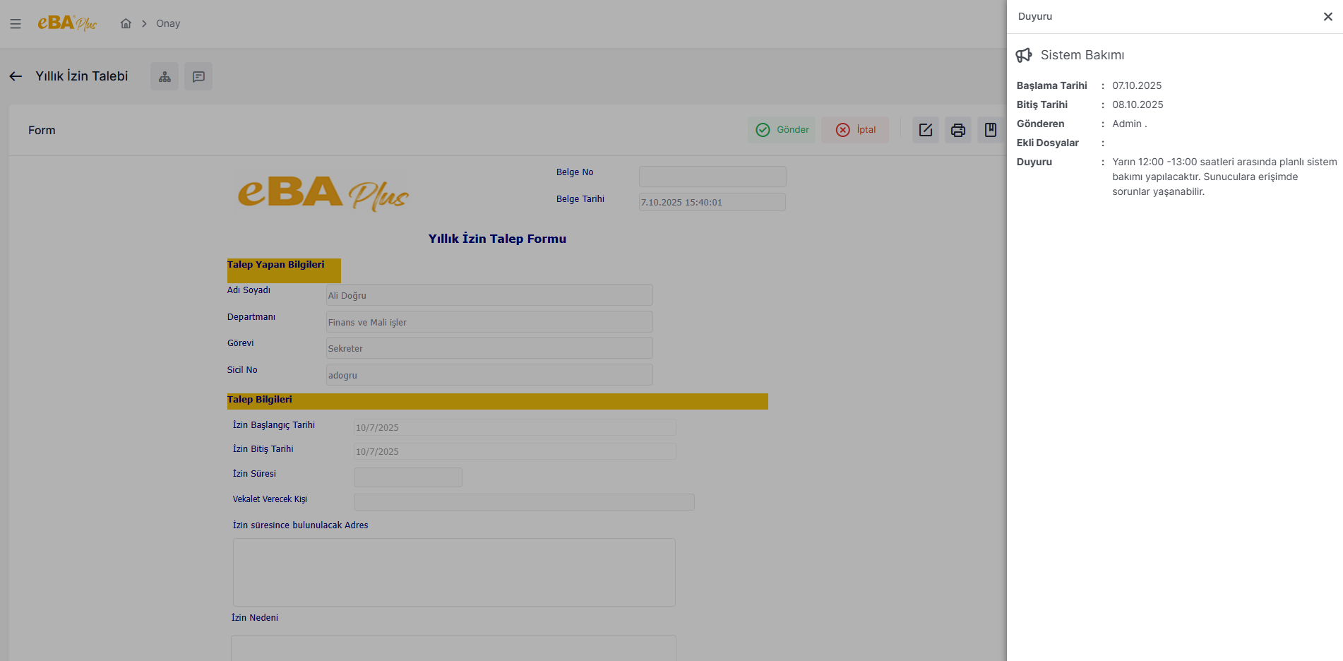 Duyuru ikonunun üzerinde, yalnızca kişiye gelen, okunmamış duyuruların sayısı gösterilir. Kişi arayüzde işlem yaparken bir duyuru yayınlandığında, bu bilgi sağ üst duyurular ikonunda sayı olarak gösterilir. Duyuru ikonuna tıklandığında, işlem yaptığı ekran kapanmadan, gelen duyuru mesajına hızlıca göz gezdirilebilir.