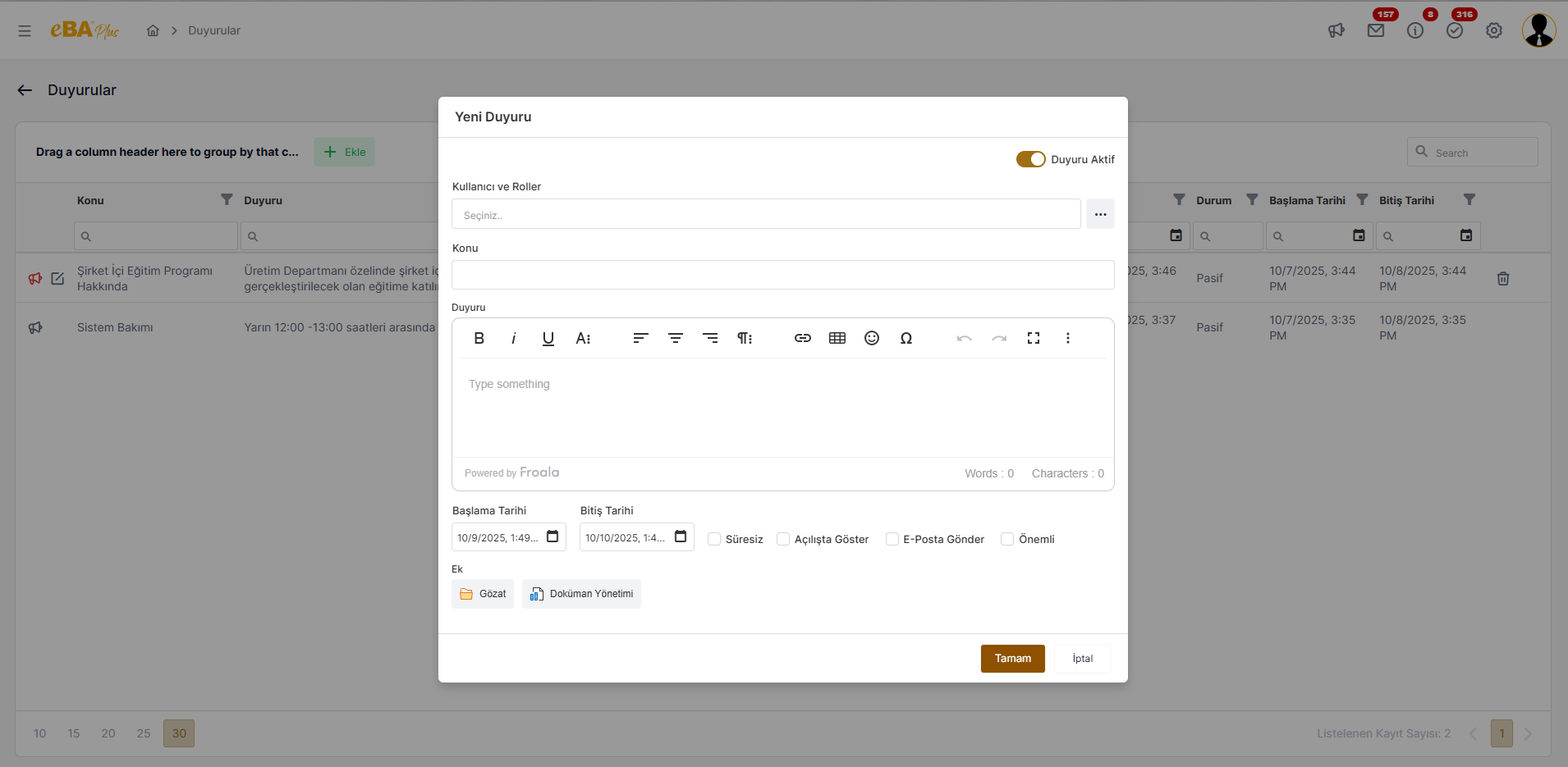 Duyuru Aktif : Bu alan işaretli iken, duyuru detayları girilip, “Tamam” butonuna basıldığında, duyuru aktif olarak yayınlanmış olur ve ilgili kişiler tarafından görüntülenebilir. Bu alan, henüz zamanı gelmemiş bir duyurunun hazırlanıp, pasif olarak eklenebilmesine ve zamanı geldiğinde aktif edilebilmesine veya zamanı geçmiş pasif bir duyurunun tekrar aktif edilebilmesine olanak tanır. Veya aktif bir duyuru, pasife çekilerek yayından kaldırılabilir.
