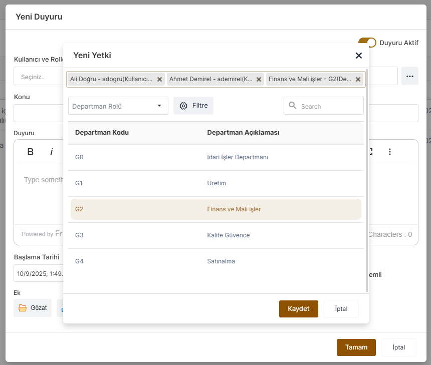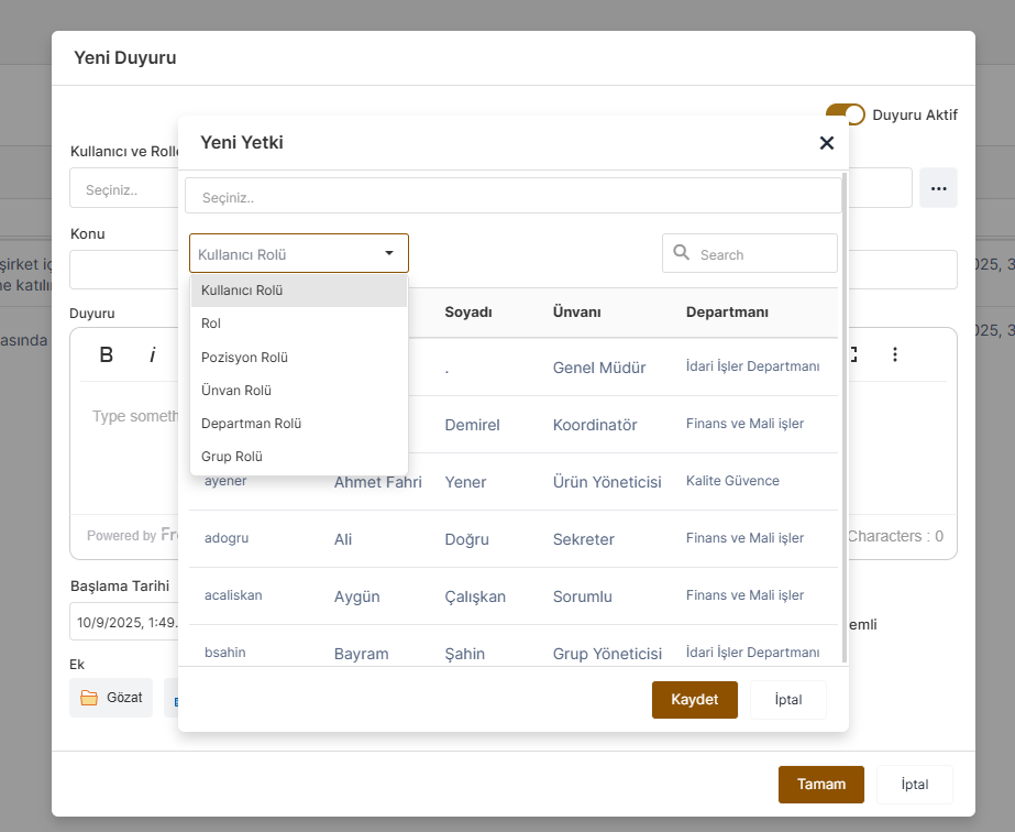 Kullanıcı ve Roller : Duyurunun kim ve kimler tarafından görüntülenebileceğinin belirlendiği kısımdır. Sadece belirli kullanıcılara, belirli rollere, pozisyonlara, unvan, departman veya gruplara özel duyurular yayınlanabilir. Bu alandan, duyurunun gösterilmesi istenen kişi ya da kişilerin seçimi yapılabilir. “Kullanıcı ve Roller” alanına tıklandığında, kullanıcı ve rol seçimlerinin yapılacağı ayrı bir modal ekran açılacaktır.