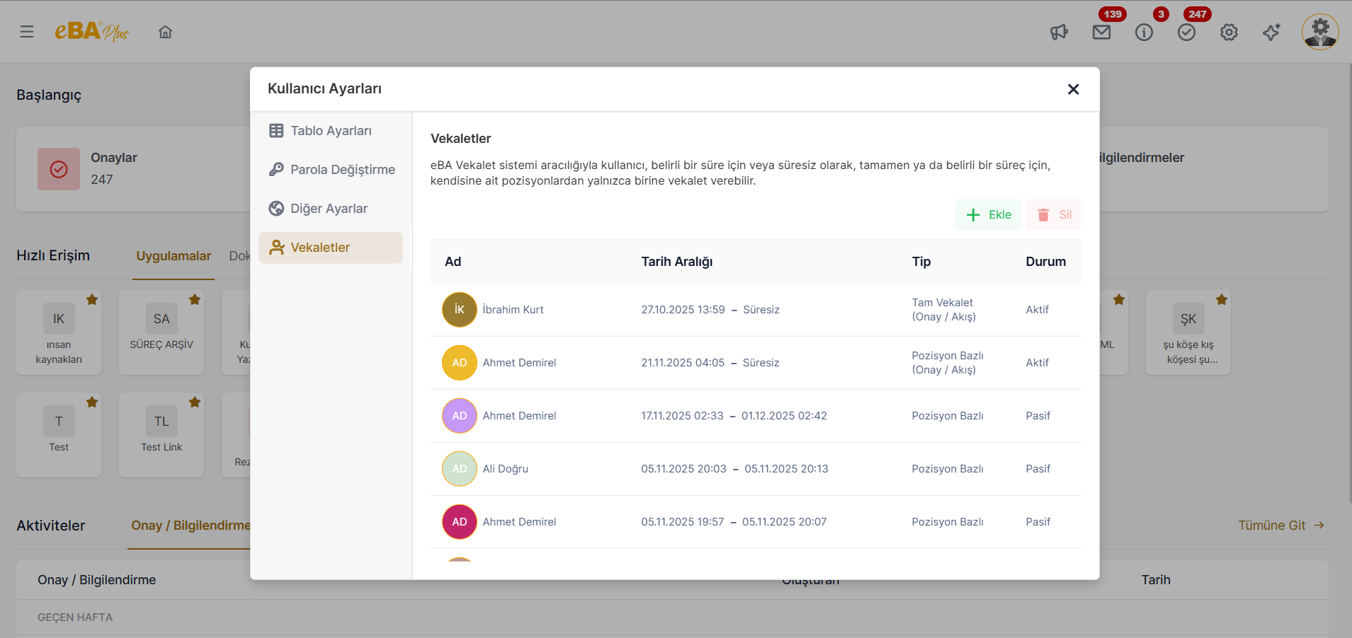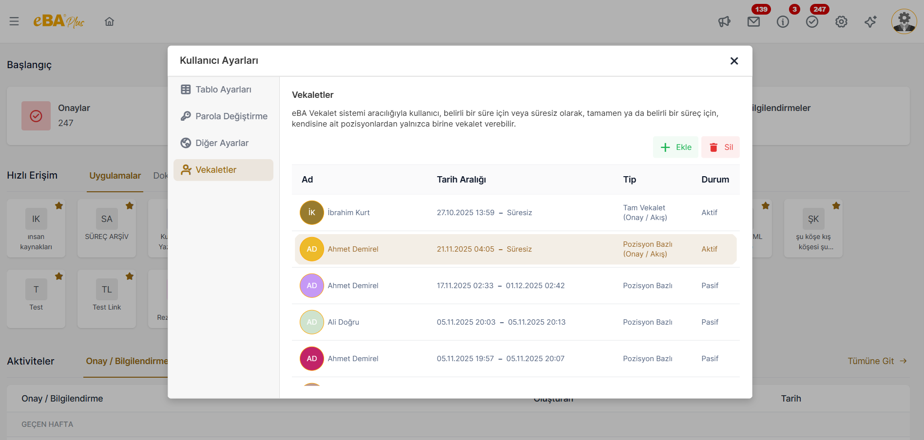 Vekalet sekmesinde, kişinin daha önce vermiş olduğu vekaletler listelenir. Bu listede herhangi bir vekalete tıklandığında yukarıda bulunan “ Sil ” butonu aktif olur. Sil butonuna tıklandığında tanımlanmış bir vekalet sistemden kaldırılabilir.