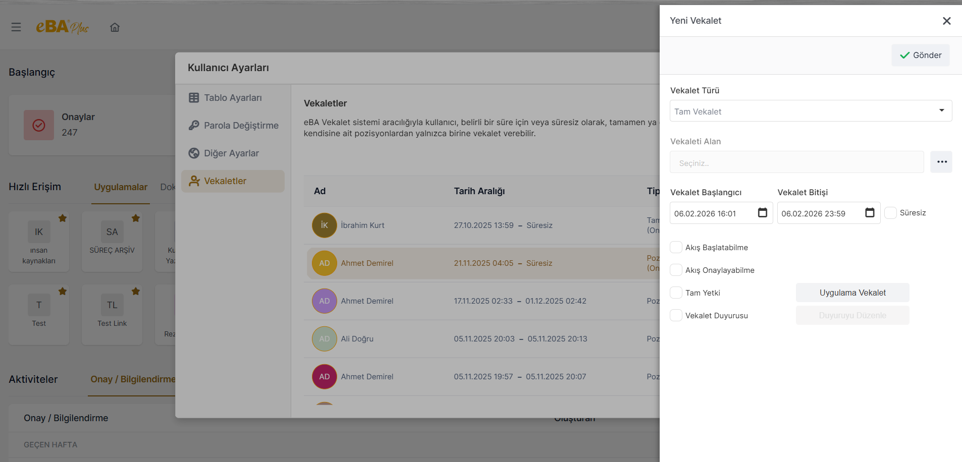Gönder : Vekalet ayarları girildikten sonra “Gönder” butonuna tıklanarak, belirlenen özelliklerde bir vekalet kaydının sisteme oluşturulması sağlanabilir.
