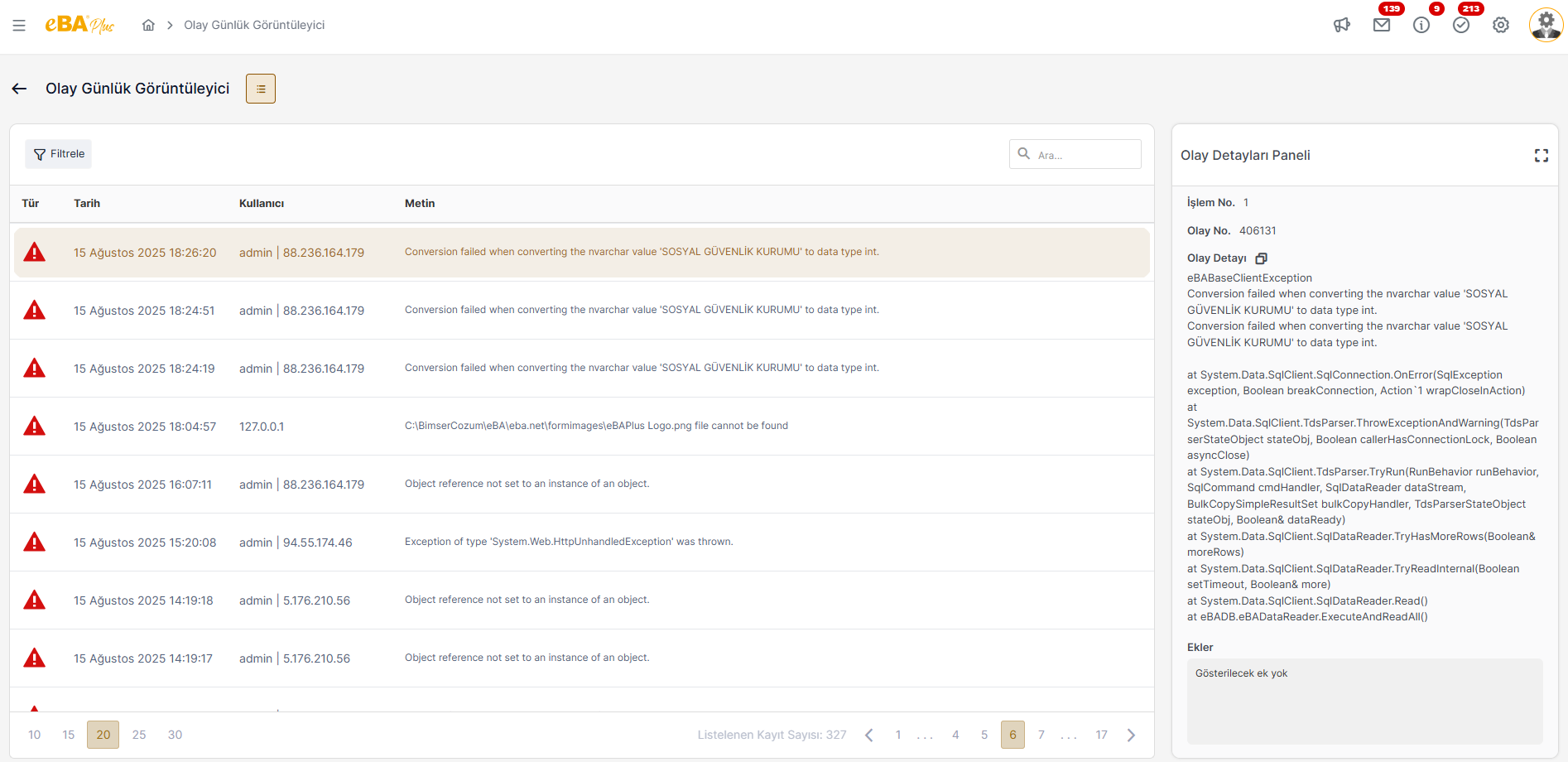 “ Olay Günlük Görüntüleyici ” ekranında listelenen log kayıtlarından birine tıklandığında sağ tarafta ilgili log kaydına ait detayların gösterildiği detay paneli açılır.