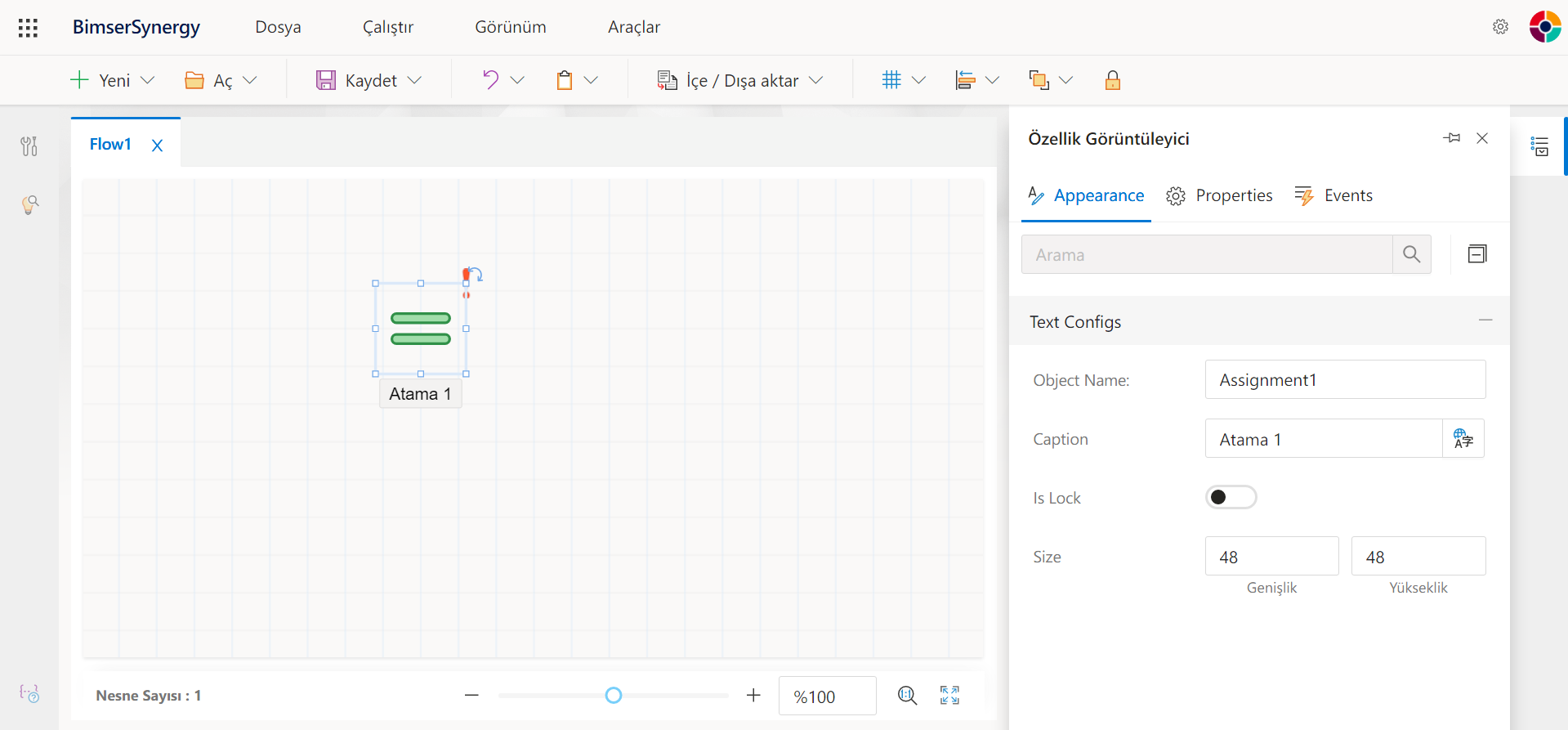 When the assignment object is clicked, there are "Appearance", "Properties" and "Events" tabs in the Property Viewer panel.
