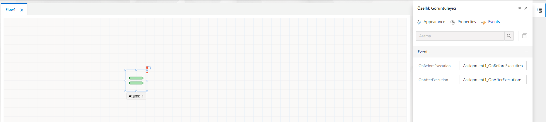 The events owned by the assignment object are located in the "Events" tab in the Property Viewer panel. Each event is triggered at different runtime moments, performing its own unique operations. Code written by the developer to these events is also executed at the time the corresponding event is triggered. To write code for any event, double-click the appropriate event line from the Events tab. The screen is directed to the flow code editor section named "FlowName.cs" and the method block for the clicked event is automatically created. The developer can construct any code block he wants in this method. Next to the event whose method is created on the code side by clicking from the Events tab, the method name information is automatically generated and the relationship between the event and the method is indicated.