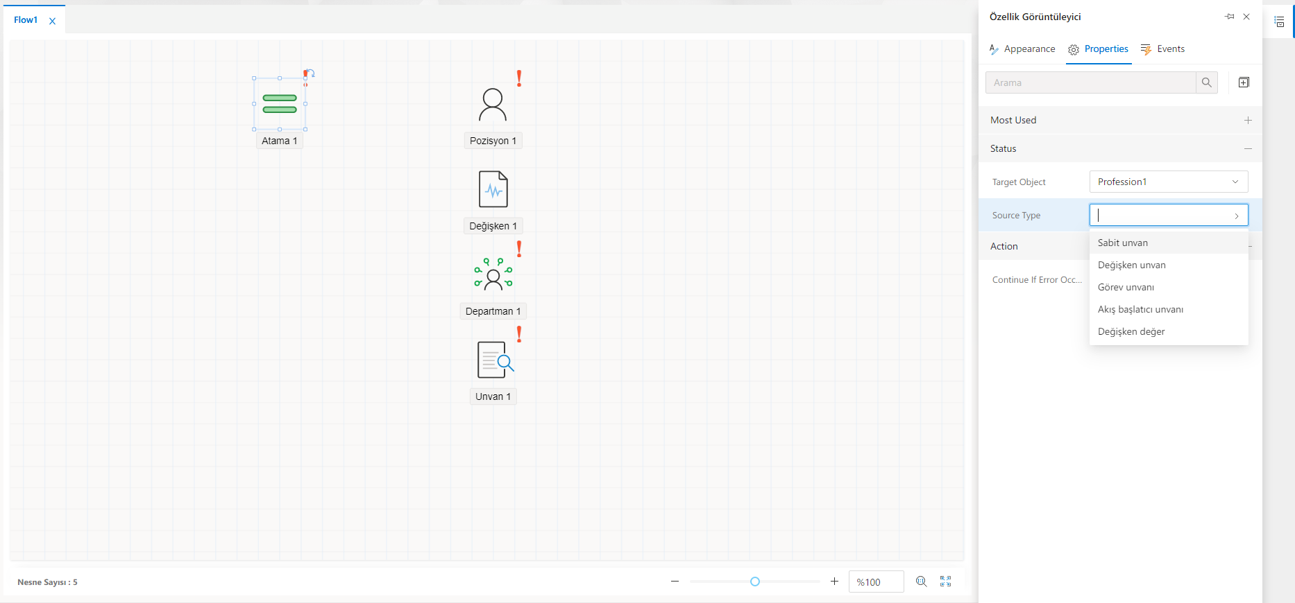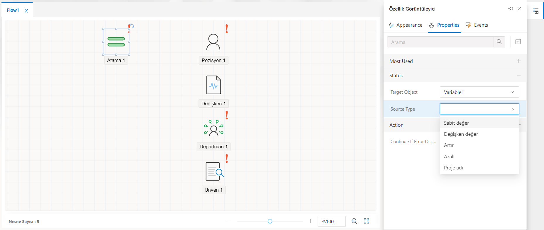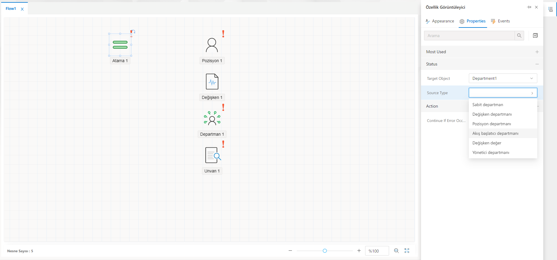 | Department | Variable department | Used to assign the department value from another department object used in the flow | As source data, all department objects used in the flow design are listed. The department object in which the record maintained is desired to be assigned is selected from this list |
