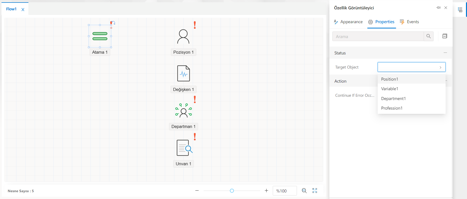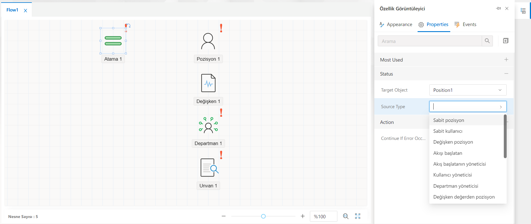 | Position | Position from variable value | Used to assign to the selected target object the position code value contained in a "Variable" object in the flow, or the return value from a "Function" object that sends the position code as the return value in the flow | As source data, the "Variable" and "Function" objects used in the flow design are listed. Whichever object the position definition is intended to be assigned to the target object, that object will be selected from this list.<br/>``````<br/>The variable object must hold the position code. The function object must send a position code as the return value. |