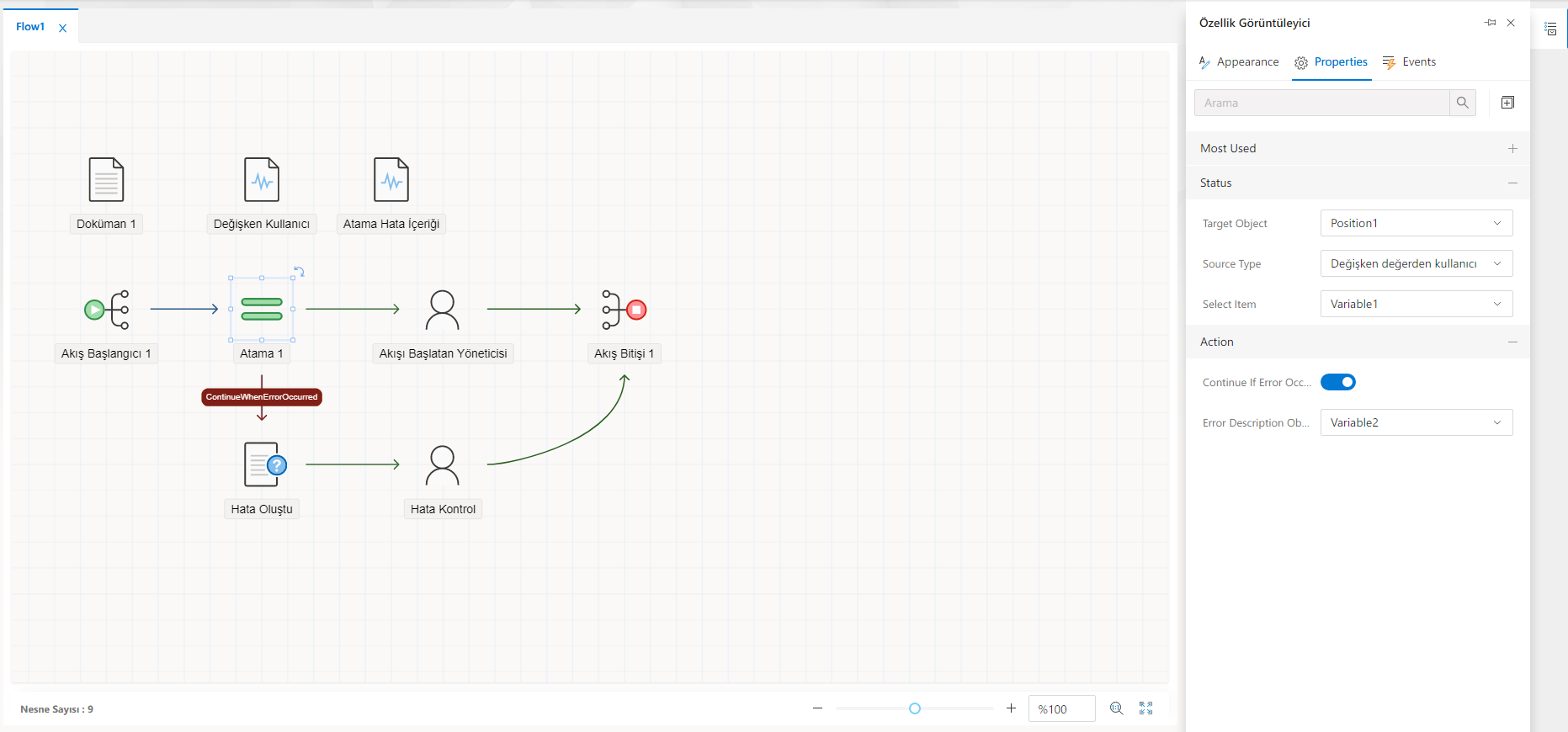'Continue If Error Occurs' - When the feature is activated, the ContinueIfErrorOccured connection arrow is used in addition to the Contunie connection arrow for the Assignment object. When the assignment process cannot be done due to incorrect design in the object, lack of assignment information, etc., the process can proceed through this arrow instead of giving an error on the end user side, and the process can be made to perform a different operation when an error occurs.