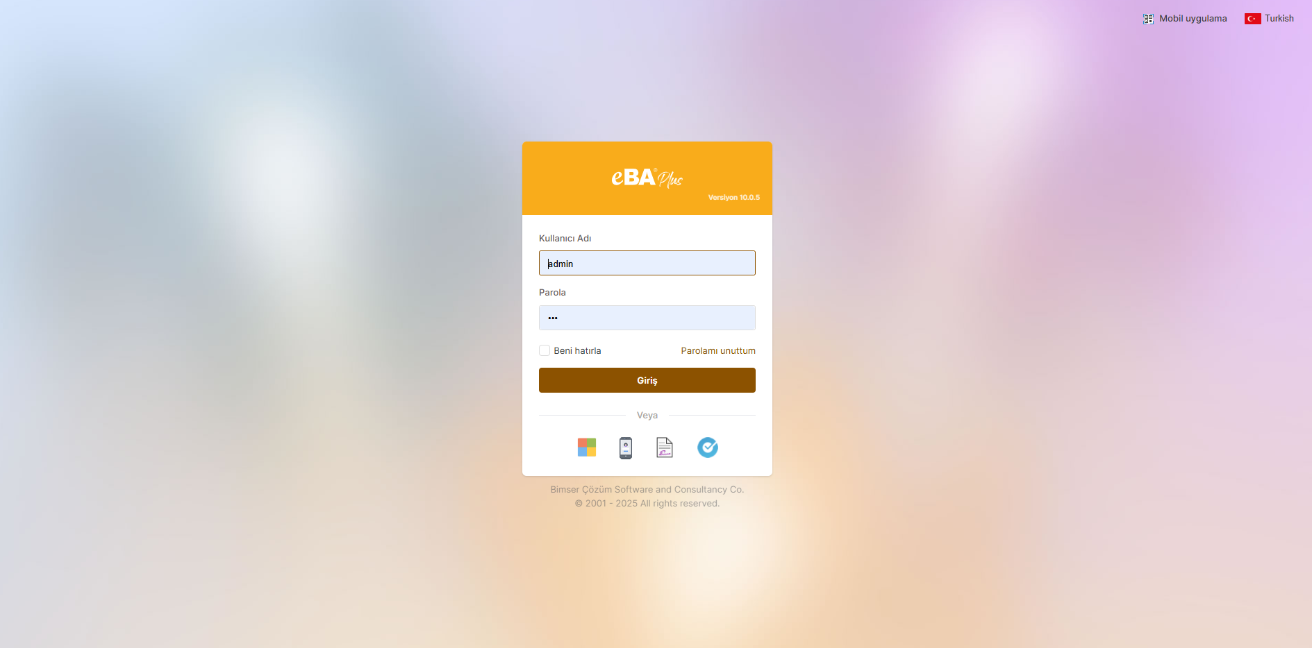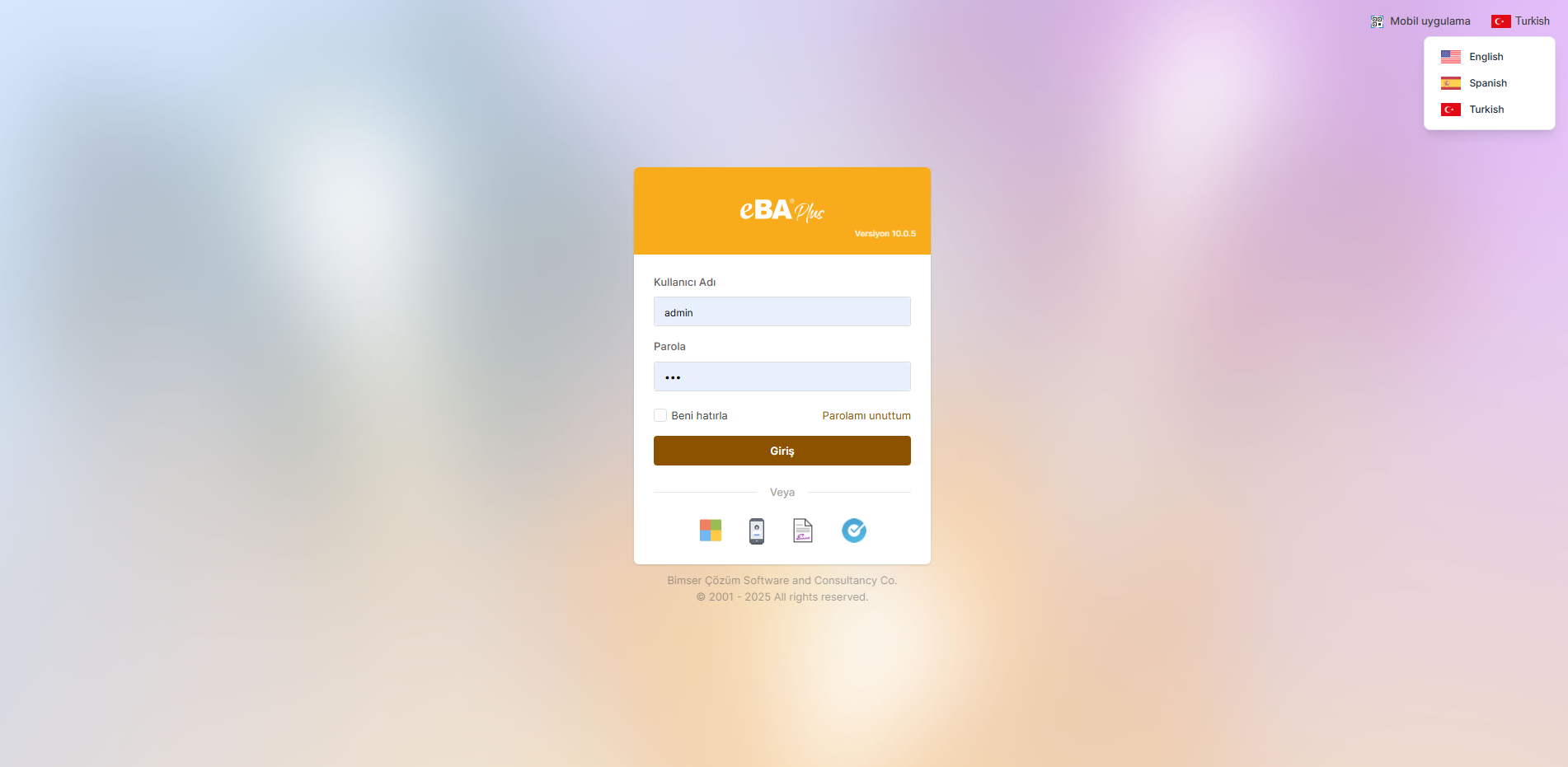 Web arayüzüne giriş yapmak için kullanılan ekrandır. Standart giriş olarak, eBAPlus ortamında tanımlı kullanıcı adı ve şifre ile web arayüzüne giriş yapılır. Sistem, standart giriş seçeneğinin yanı sıra, [LDAP](C:\Users\cdal\Desktop\docs-bimser\docs\eBAPlus\web_interface_docs\Yardımcı Dokümanlar\LDAP Konfigurasyonu.md), Azure AD, Mobil İmza, Elektronik İmza, Okta ve custom seçenekleri ile girişlere de imkan tanımaktadır.