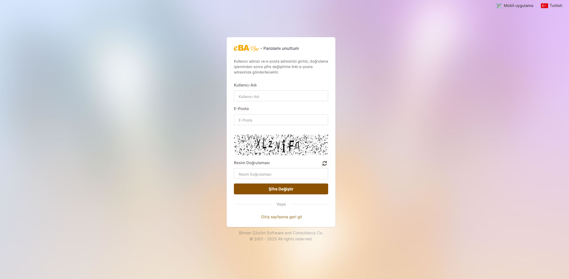 Arayüze giriş yapacak kullanıcı, eBAPlus ortamında tanımlı parolasını unutmuşsa “ Parolamı Unuttum ” linki ile şifresini resetleyebilir. “Parolamı Unuttum” linkine tıklandığında şifre resetleme ekranı açılacaktır.