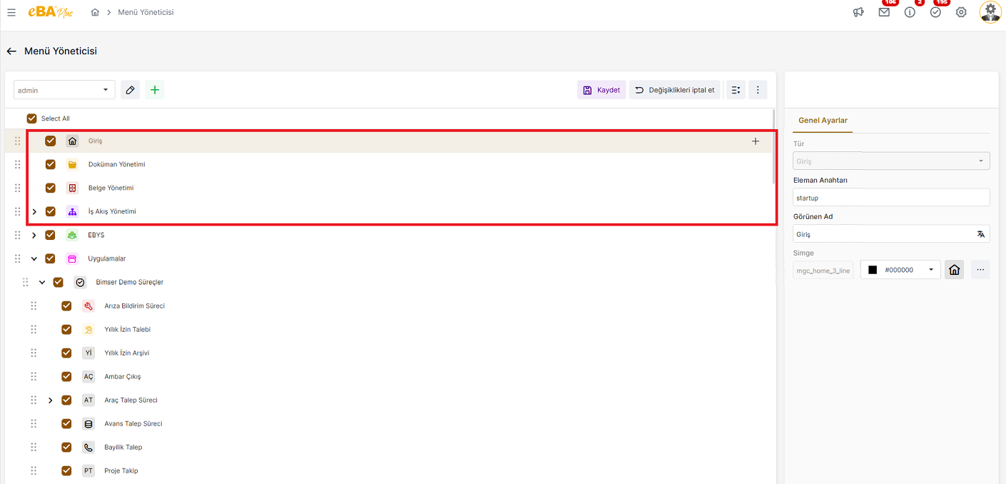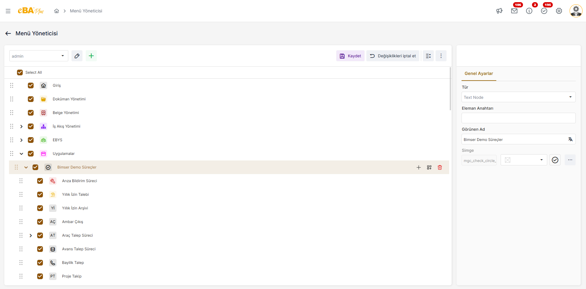 Ağaç yapısından bir düğüme tıklandığında sağ tarafta o düğüme ait “ Genel Ayarlar ” paneli açılır. Sistem varsayılan düğümlerin tıklandığında açılan Genel Ayarlar panelinde, ilgili düğümün yalnızca eleman anahtarı, görünen adı, simgesi ve ikonu değiştirilebilir. Tür alanı değiştirilemez. Sistem varsayılanı olmayan ve sonradan eklenen menü düğümlerine tıklandığında, Genel Ayarlar panelinden, ilgili düğümün ayarları düzenlenebilir.