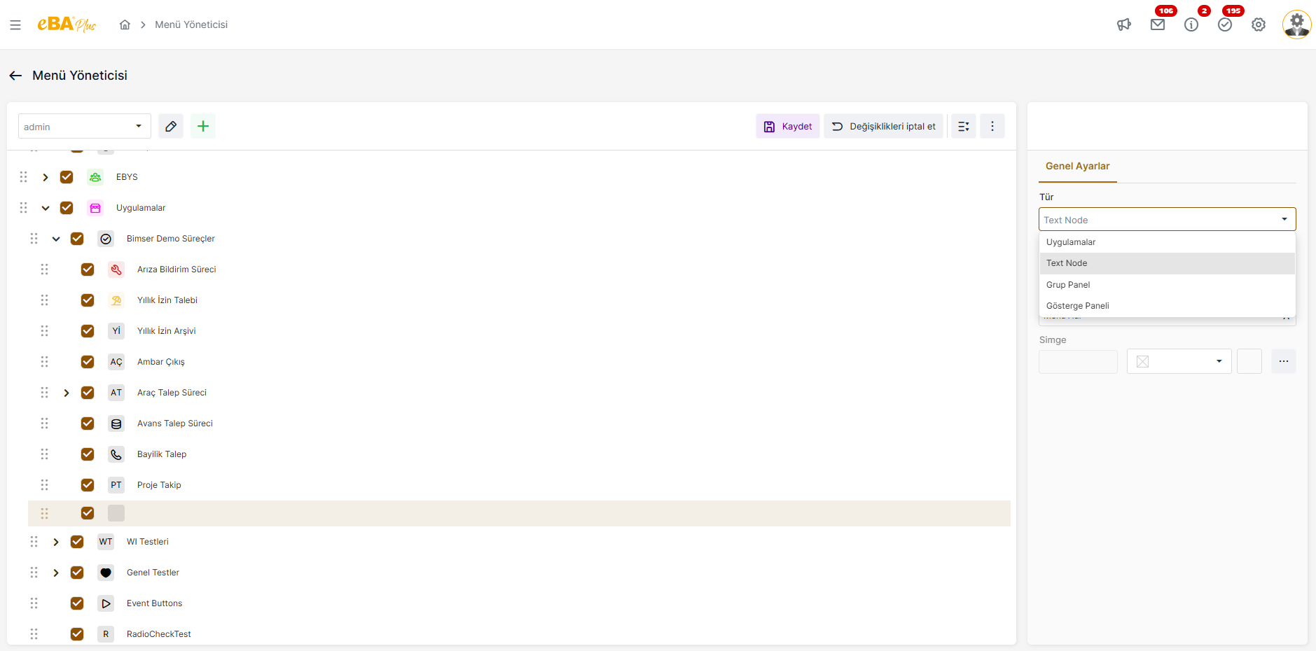 Menü ağaç yapısına yeni bir düğüm eklendiğinde, o düğüme tıklanır ve düğüm ayarları “ Genel Ayarlar ” panelinden tanımlanır. Genel Ayarlar panelinde, “ Tür ” olarak; Uygulamalar , Text Node , Grup Panel ve Gösterge Paneli seçenekleri listelenir.