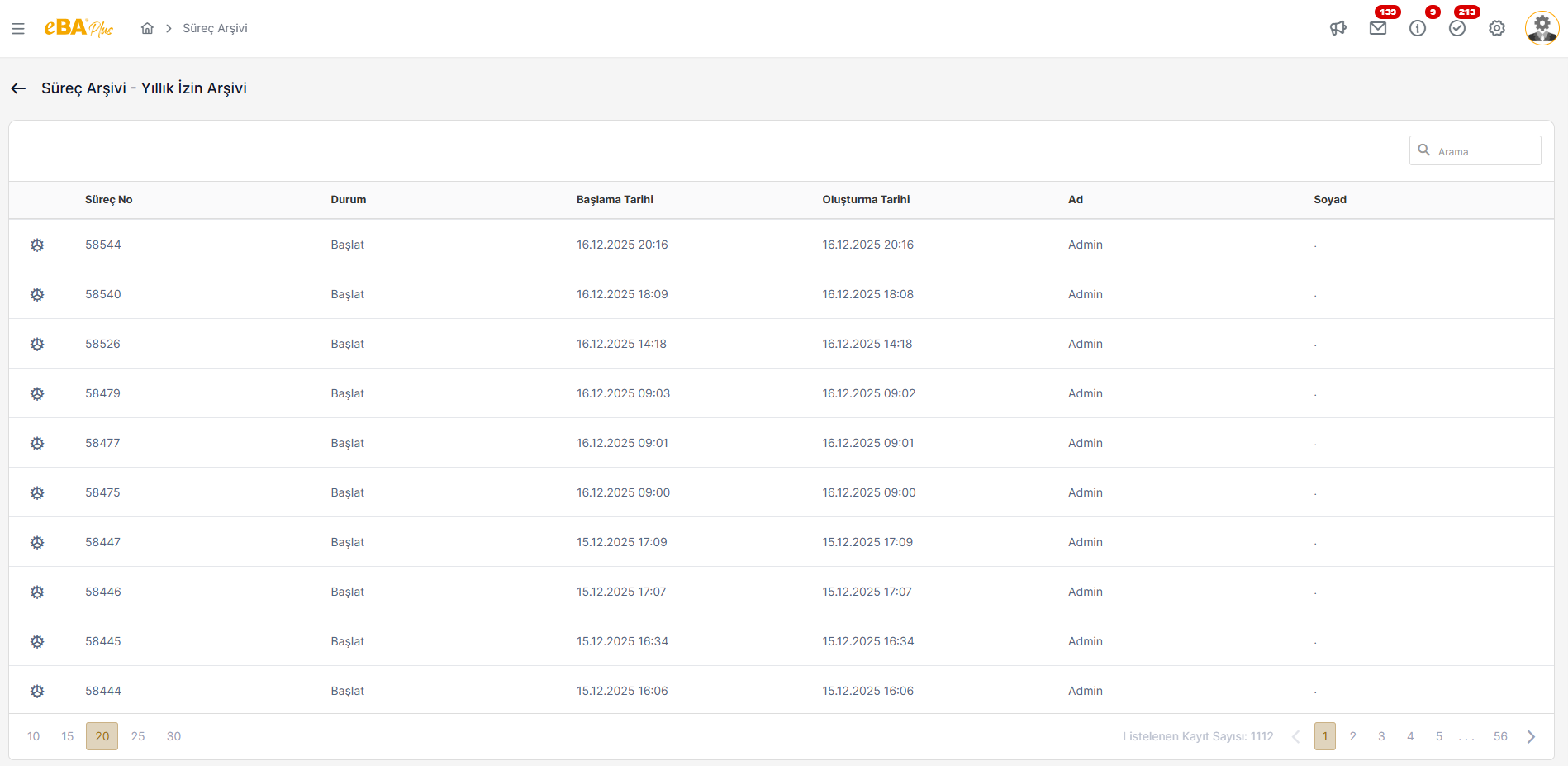 Menüye “Süreç Arşivi” tipinde oluşturulan bir menü düğümüne tıklandığında, ilgili projeye ait arşiv yapısı aşağıdaki gibi görülecektir.