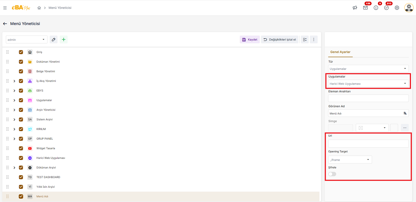 eBAPlus içerisinden bir menü düğümüne tıklandığında, harici bir web uygulamasının açılması isteniyorsa bu menü tipi kullanılmaktadır. “Uygulamalar “ alanında bu seçenek seçildiğinde “ Url ”, “ Opening Target ” ve “ Şifrele ” alanları görünür olur.