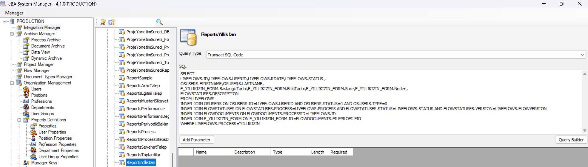 Sistemin standart kolonlar ile oluşturduğu süreç ve form arşivlerinin getirdiği veriler yeterli olmadığı durumda ve daha kompleks arşiv yapıları gerektiğinde bu tür kullanılır. İhtiyaç duyulan arşiv verileri ve alanları için, System Manager -> Integration Manager alanında, arşiv sorguları hazırlanır.