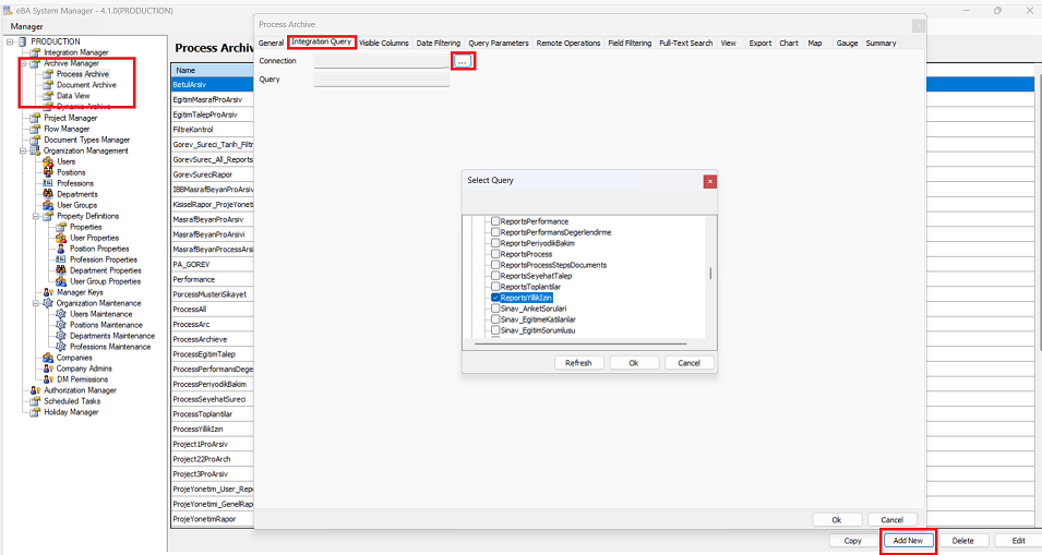 Hazırlanan arşiv sorguları, System Manager -> Archive Manager başlığı altında bulunan arşiv tiplerinden biri için seçilerek ayarlamaları yapılır ve menü düğümüne eklenecek şekilde sisteme yeni bir arşiv tanımlanmış olur.