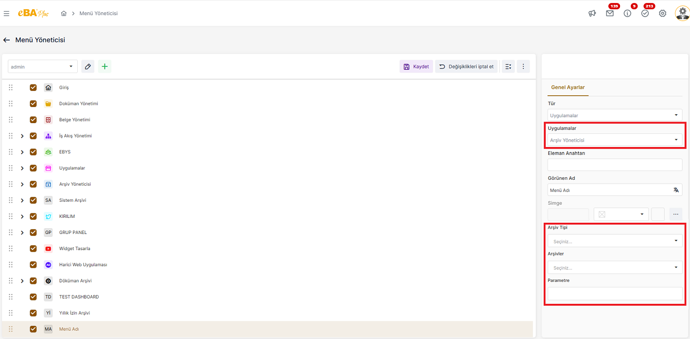 Arşivler : Arşivler alanında, arşiv tipi olarak seçilen tipe ait, System Manager da tanımlanmış tüm arşivler listelenir. Menü düğümüne tıklandığında hangi arşivin açılması isteniyorsa bu alandan ilgili arşiv seçilmelidir.