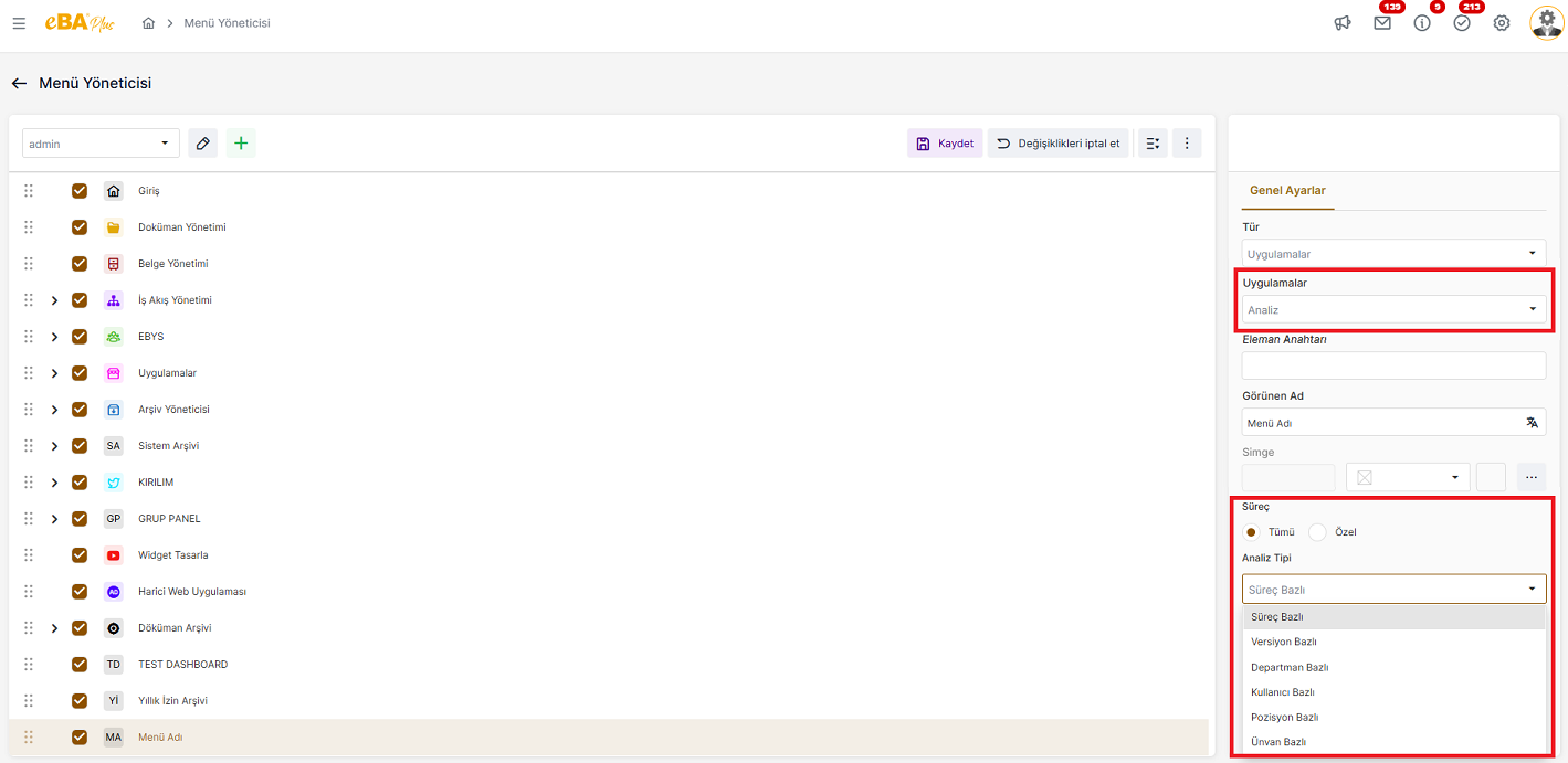 Sistemde belirlenen kriterlere göre analiz yapılarının çıkarılması için kullanılan düğüm türüdür. “Uygulamalar “ alanında bu seçenek seçildiğinde “ Tümü ”, “ Özel ” ve “ Analiz Tipi ” alanları görünür olur.