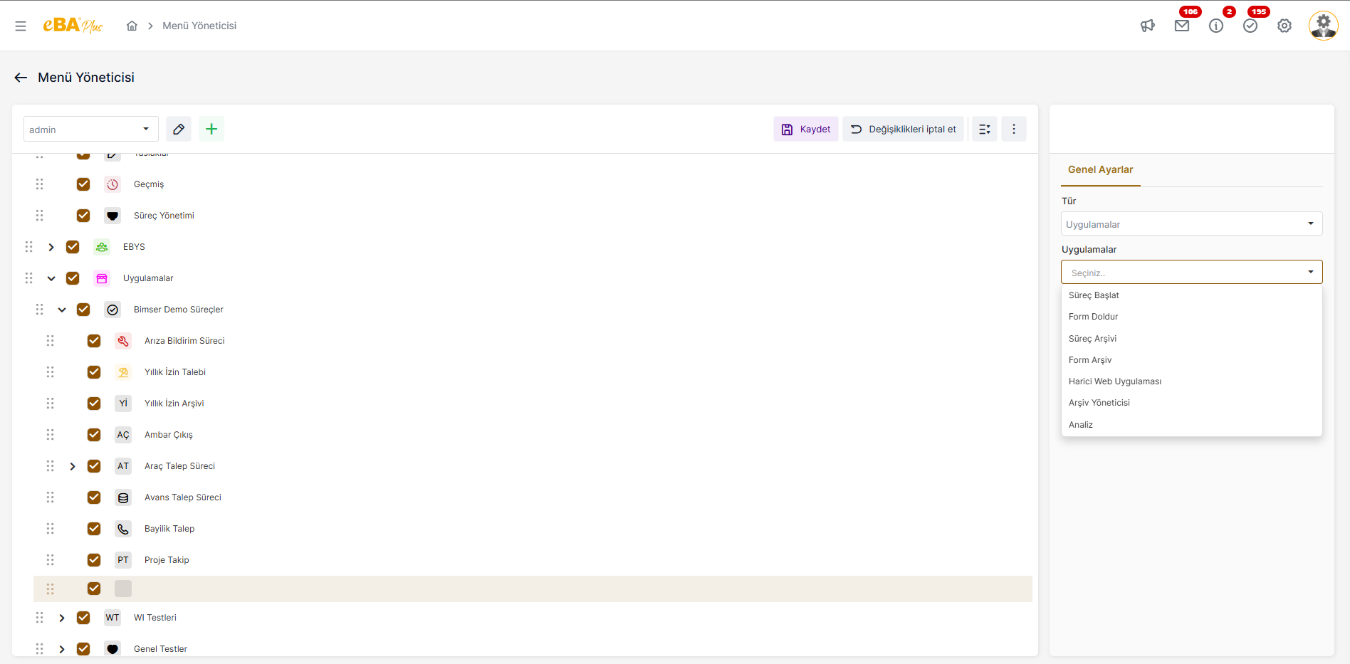 İlgili menü düğümüne tıklandığında herhangi bir uygulama açarak çalışması isteniyorsa Tür alanından “Uygulamalar” seçeneği seçilir. Uygulamalar seçildiğinde, Genel Ayarlar panelinde “ Uygulamalar ” alanı görünür olur.