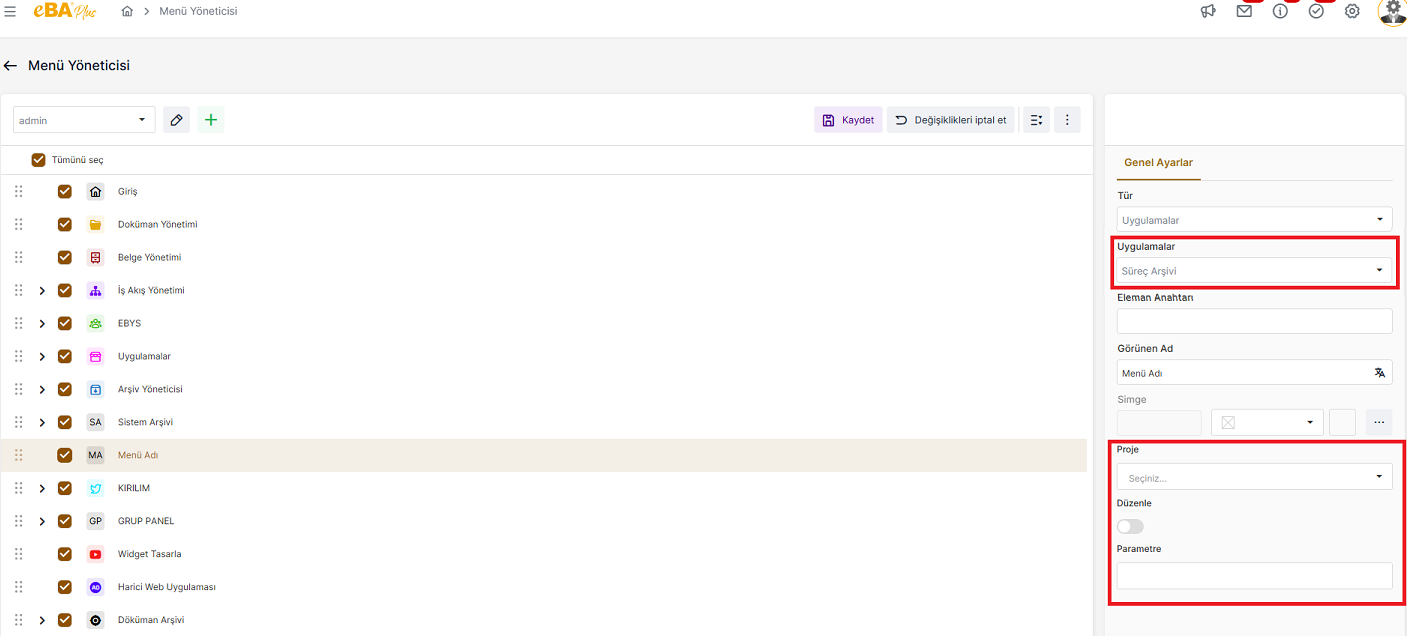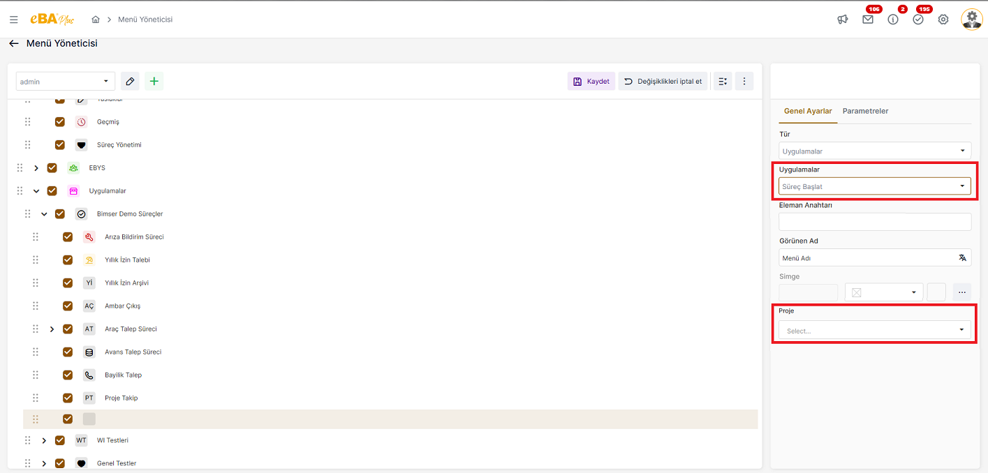 İlgili menü düğümüne tıklandığında, sistemde tanımlı süreçlerden birinin başlatılması isteniyorsa, o menü düğümü için Uygulamalar kısmında “Süreç Başlat” seçeneği seçilir. Süreç Başlat seçeneği seçildiğinde “ Proje ” alanı görünür olur.