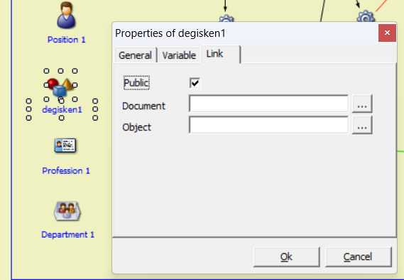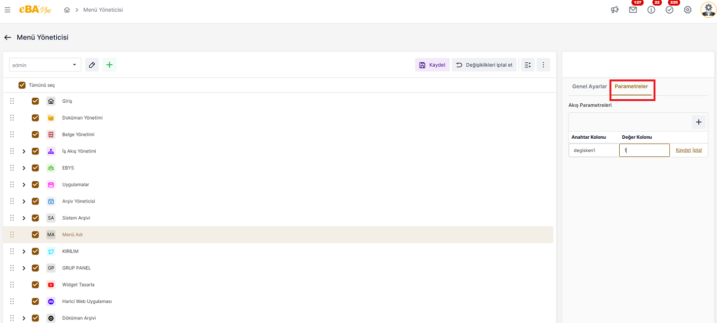 Burada dikkat edilmesi gereken kısım, parametre gönderilmek istenen sürecin akış kısmına, “ Anahtar Kolonu ” alanına yazılan parametre anahtarı ile aynı isimde public bir değişken nesnesi eklenmesi gerekliliğidir. Akış tarafına eklenen değişken nesnesinin adı ile, menü düğümünde verilen anahtar kodu aynı değilse, menü düğümüne tıklandığında akışa gönderilen parametre değeri, akış tarafından karşılanamaz. Aynı zamanda, menü düğümüne tıklandığında, gönderilen parametrenin akış tarafında yakalanabilmesi ve kullanılabilmesi için, ilgili akış değişkeni özelliklerinde public alanının işaretli olması gerekir.