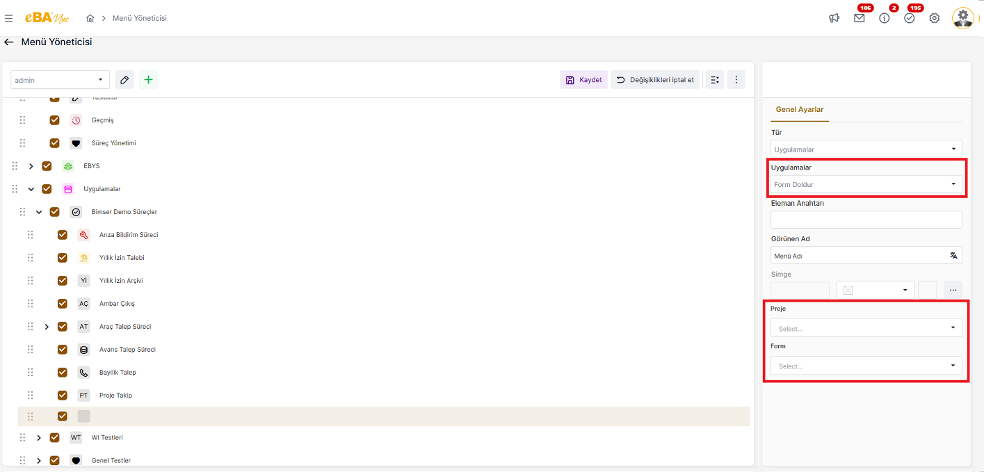 İlgili menü düğümüne tıklandığında bir formun açılıp, doldurularak kaydedilmesi isteniyorsa, o menü düğümü için Uygulamalar kısmında “Form Doldur” seçeneği seçilir. Form Doldur seçeneği seçildiğinde “ Proje ” ve “ Form ” alanları görünür olur.