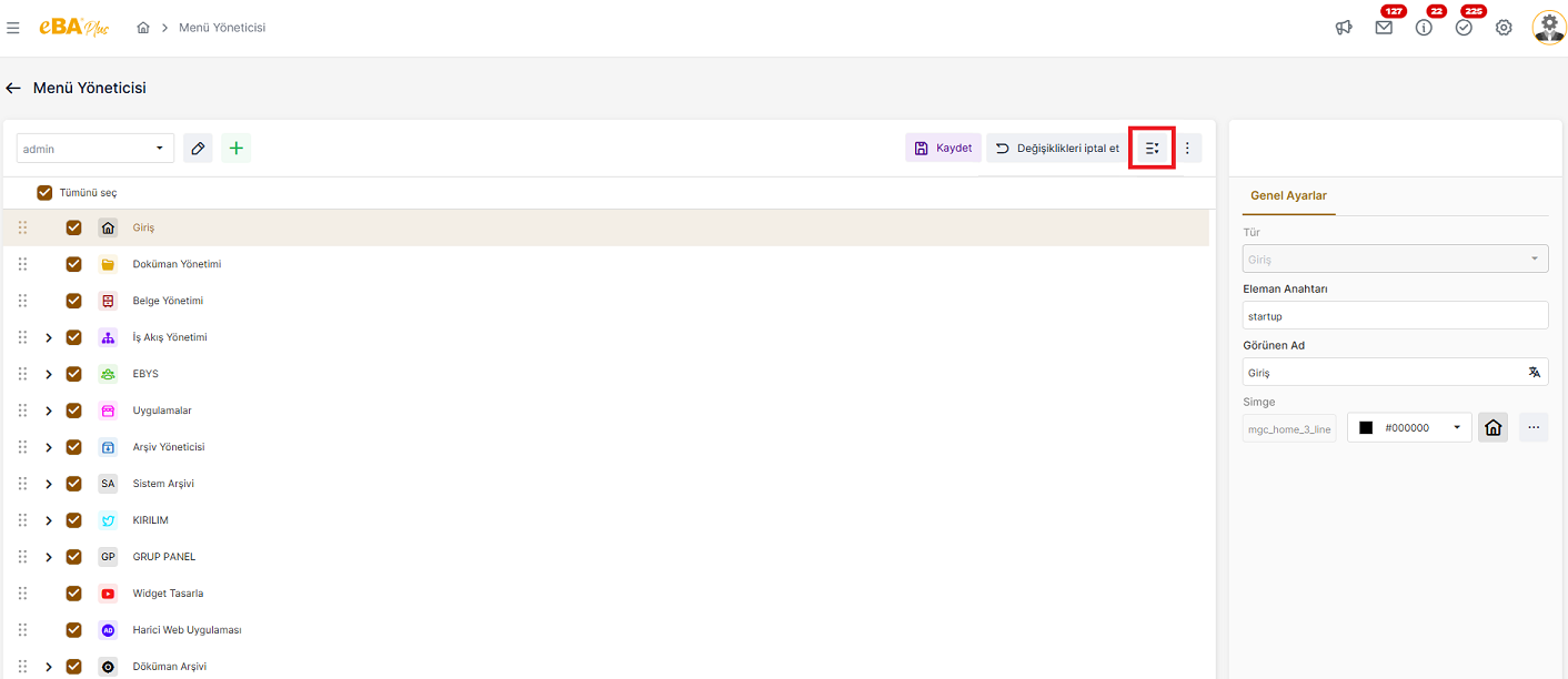 Menü ağacı her zaman tek düğümden oluşmaz, bazı yapılarda iç içe birden çok menü kırılımı barındırabilir. Menü Yöneticisi ekranında, tek tıkla tüm kırılımların açılıp, kapatılması bu menü ikonu ile sağlanır.