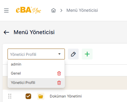 Menü profillerinin listelendiği seçim listesine tıklandığında, varsayılan “admin” profili hariç, diğer profil tanımlarının yanında bulunan çöp kutusu butonuna tıklanarak, mevcut bir profil silinebilir.
