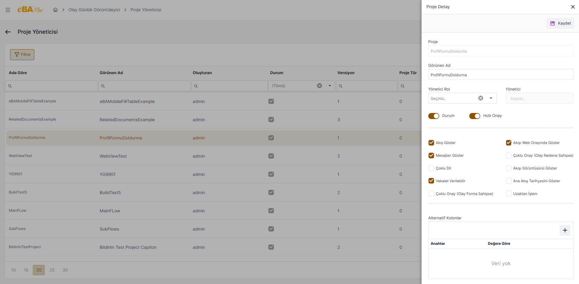 Alternatif Kolonlar : İlgili projenin onayları için custom onay sorgusu kullanılıyorsa sorgudan dönen kolonlara arayüzde gösterilmesi istenen kolon isimlerinin ayarlanabileceği kısımdır.